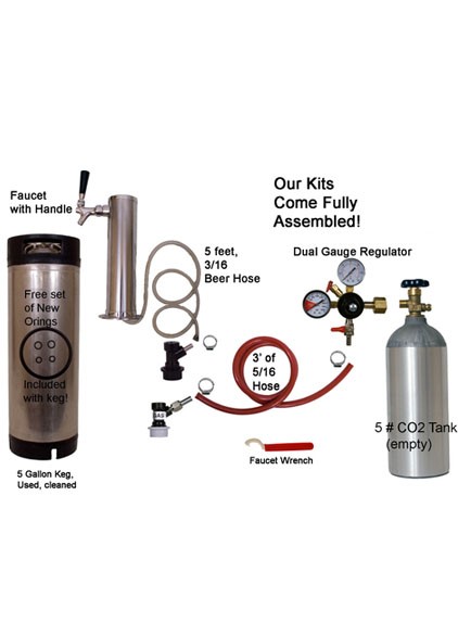 Tower Kit with Cornelius/Firestone Keg Includes Stainless Tower, Metel nozzle, 5# CO2 bottle, Cornelius/Firestone keg, commercial grade hose,5/16" Red Air Hose and 3/16" beer line, clamps, disconnects, 2 gauge regulator with check valved shutoff. Assembled and ready to go! Have a smaller fridge that 5 gallon won't fit? Email me about replacing 5 gallon with a 3 gallon keg. Keg is cleaned using a 3 step process. If you need to go between Sanke(standard commercial tap) and a cornelius style keg, email me and I can help you set this up. I have a quick connect option that will allow you to use both types with the twist of a nut!