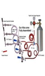Refrigerator Conversion Kit, 3 taps for 3Sanke tap kegs(Standard Commercial Beer Tap). Fully Assembled! Regulator is attached to an air manifold with Check Valves.(This is important because it keeps beer from flowing between kegs, this is an issue with kits built with TEE system) The manifold system will allow you to install and run your gas inside or outside of your fridge. When installing outside you will only need to drill one hole! This kit is designed to give you everything you need to dispense commercial beer from a Sanke tap (95% of beers on the market use this tap) except for the refrigerator. Very simple to set up, the hoses and pieces are already assembled!!! The Kit Includes: A new 5# CO2 cylinder (empty) 2 gauge CO2 Regulator with manifold, 3 Sanke Taps, Shanks for Refrigerator with line attached, me
