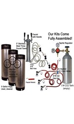 Three Faucet Tower Kit with Three Cornelius/Firestone Kegs. The kit includes: A new 5# CO2 cylinder (empty) 2 gauge CO2 Regulator CO2 Hose set up with 3 way air distributor, contains seperate Shutoff Check Valves for each gas line vs using a Tee or Cross! (Many Kits do not include seperate check valved shutoff Valves and beer can flow between kegs) Assembled and ready to go! Kegs are cleaned using a 3 step process