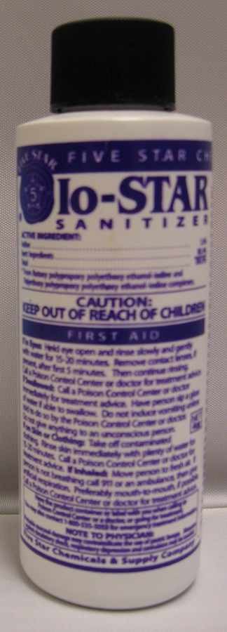 Powerful, non-chlorine iodine based sanitizer. Dilute at a rate of 1 ounce to 5 gallons of cold water. This is the same type of sanitizer that is used in many food service establishments. Easy to use in a measurable squeeze bottle. Economical dilution ration, self-indicating, controls water hardness, effective against most mold and yeast. Great for sanitizing bottles! - Additional Information